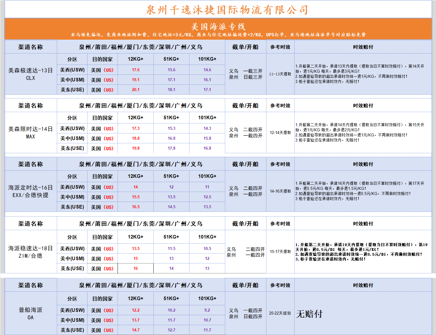 美森极速达-13日、美森限时达-14日MAX、海派定时达-16日EXX/合德快提、海派稳速达-18日ZIM/合德、普船海派OA
