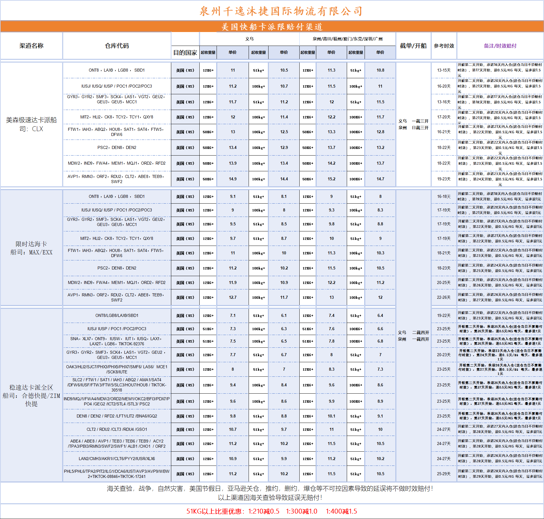 美森极速达卡派船司:CLX、限时达海卡 船司:MAX/EXX、稳速达卡派全区 船司:合德快提/ZIM快提